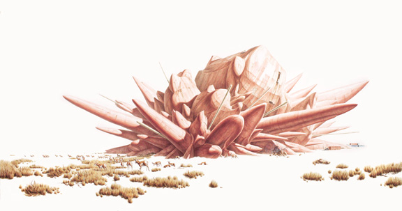 Additionally, I am interested in how we shape, mark, and manipulate the landscape, and the structures we build in those landscapes. Although we have a great capacity to alter the earth, natural forces dictate the shape our buildings take, and change them with weather, time, and the colonization of other species. In the wake of the wide swath we cut through the planet, we leave the world changed. What concerns me is whether we acknowledge that, and see how we fit, as large lovely-brained primates, within our given ecosystem.